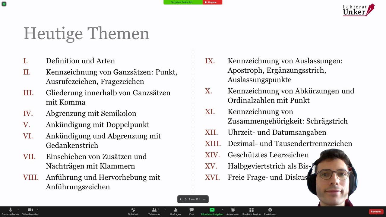 Die letzten beiden Webinare (Online-Seminare) zum Thema „Zeichensetzung im Deutschen – Regeln und Beispiele“ fanden am Samstag, den 11.08.2018, 15:00–17:00 Uhr, und Samstag, den 17.04.2021, 11:00–13:00 Uhr, statt.