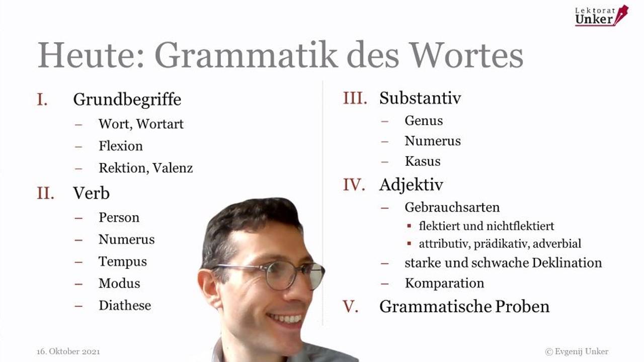 - Grundbegriffe: Grammatik, Wort, Wortart, Flexion, Konjugation, Deklination, Rektion, Valenz